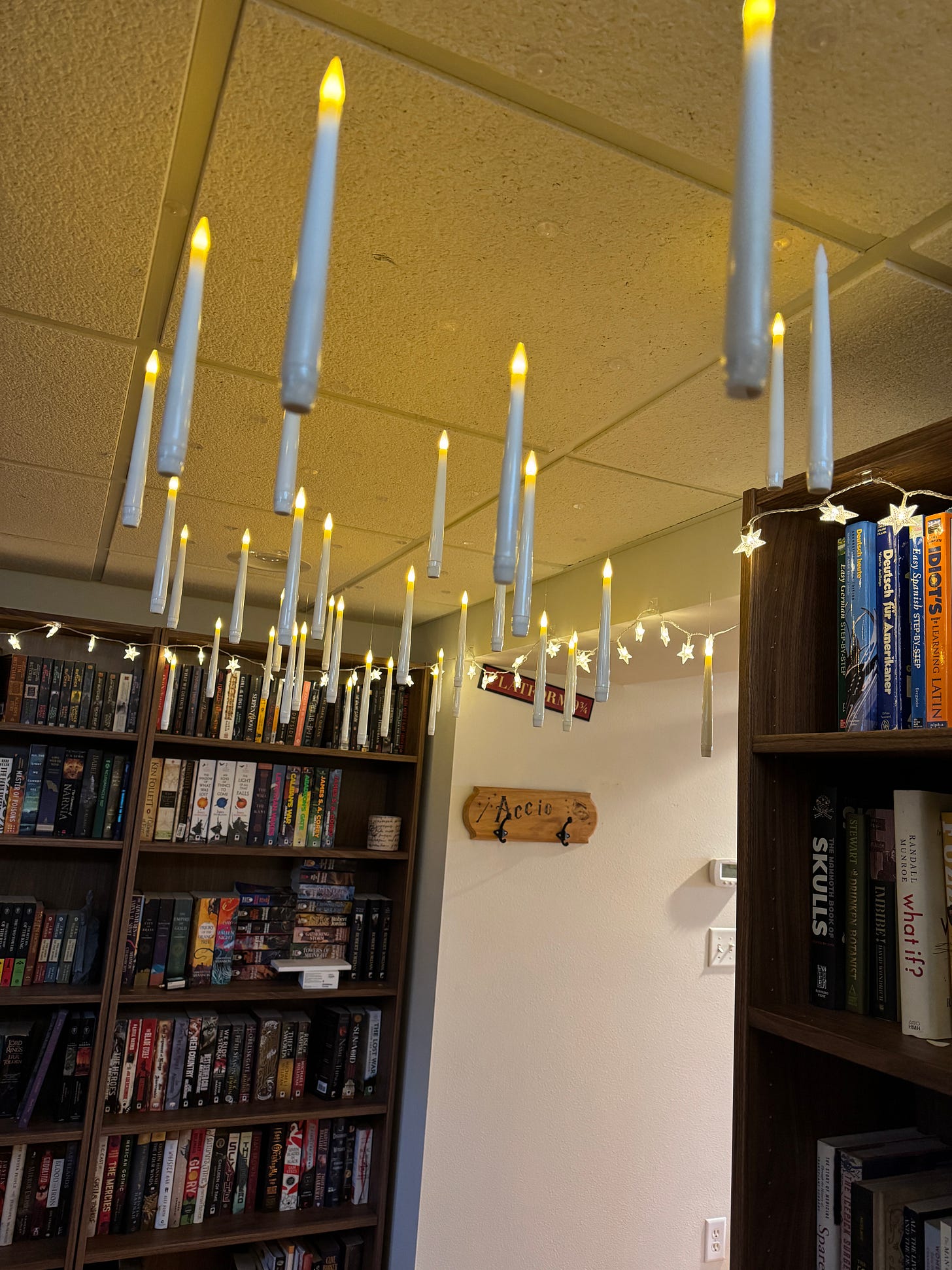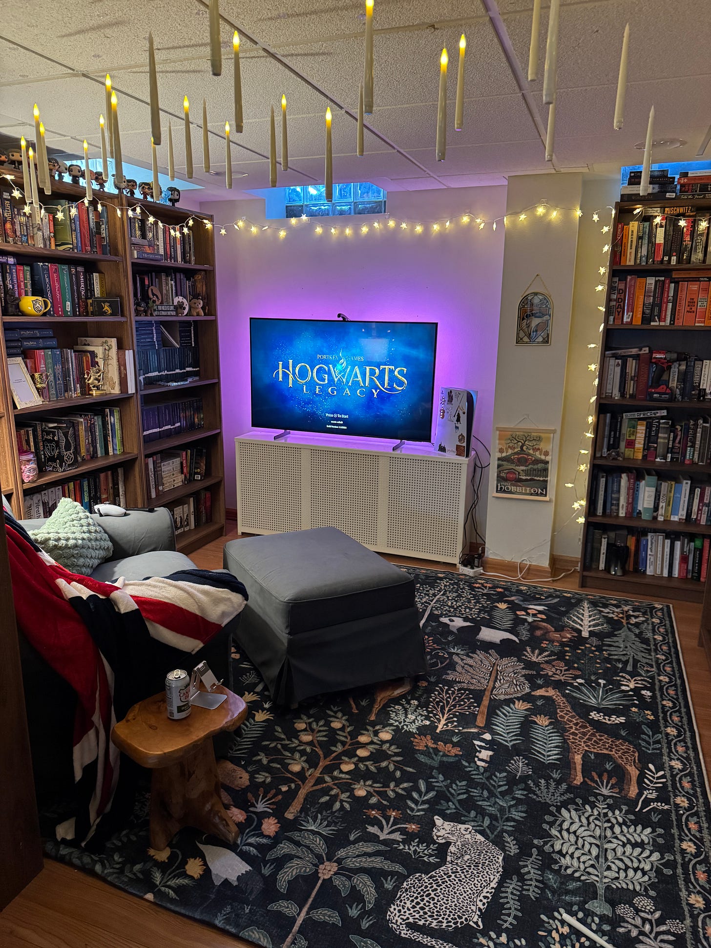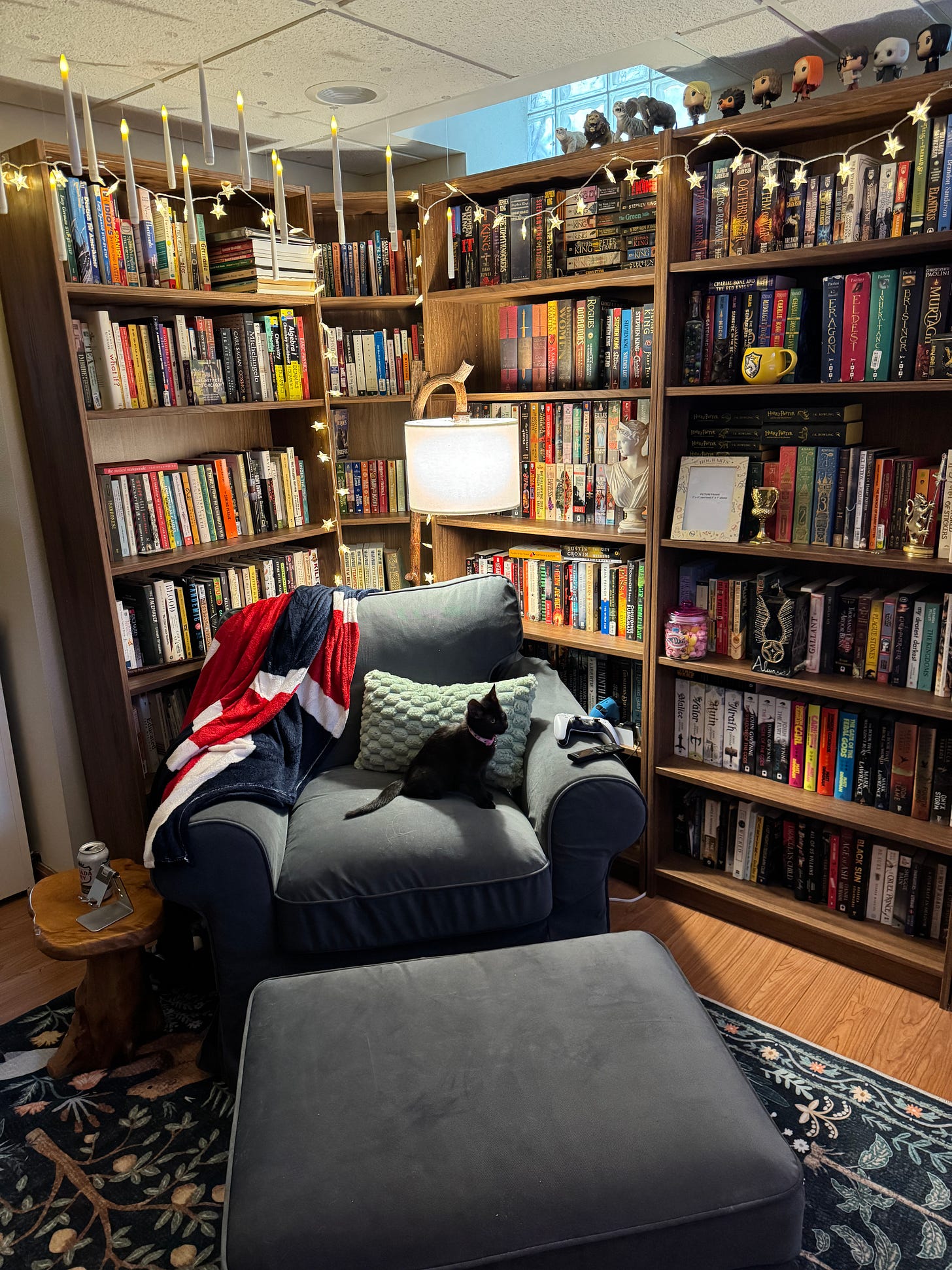 I set about the next few months intermittently working on the room, moving all of my books in boxes (there were so, so many boxes), and setting up bookshelves. I bought an area rug with animals all over it, a comfortable armchair, and a standing lamp. I hung candles up with fishing string from the ceiling to make it look like there were floating candles. I had a vision, and a mission to concentrate all of my Harry Potter and magic memorabilia and make this a magical and fantastic library.