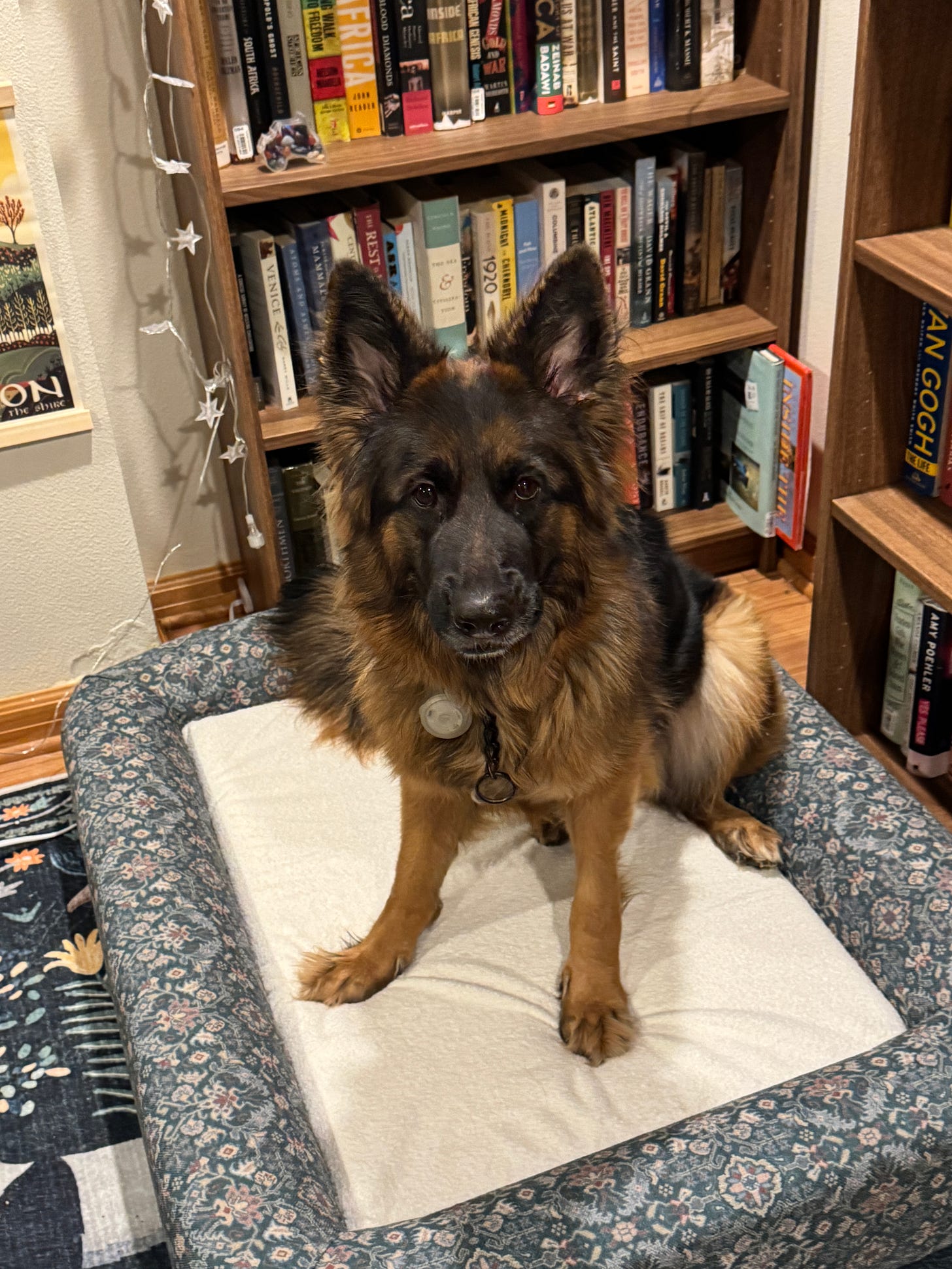 I didn’t stop there. As you can see in the picture above, I hung string lights throughout the room, creating a comfortable ambiance without overhead lighting. The Billy bookshelves nearly reached the ceiling of the room, which was relatively low, creating a cave-like feel that might make someone feel claustrophobic, but it was like a warm hug full of books. I could only fit 7.5 bookshelves in the room, and even that didn’t feel like I had enough. I built an IKEA armchair and had to be conservative about how it fit into the space, not wanting a massive armchair that felt more like a bed than a reading chair.